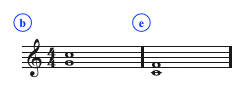 b) En cambio en este ejemplo puede apreciarse auditivamente dos sonidos diferentes. El nuevo sonido (Sol) entra en consonancia perfecta con la fundamental. La inversión del mismo intervalo, su cuarta justa parece ser consonante de igual forma.