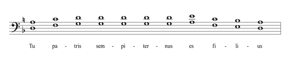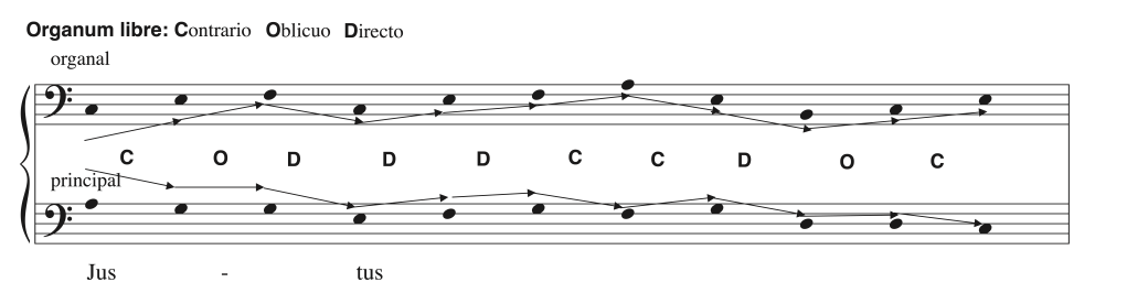 Vemos en el siguiente ejemplo la voz principal llamada organum duplicada a la quinta inferior. Ambas voces, además vuelven a estar duplicadas a distancia de octava.
