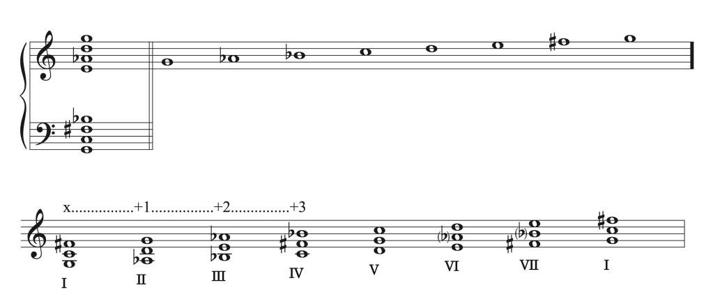 El sistema modal de armonías por cuartas desarrollado por Javier Darías, contiene la peculiaridad de ofrecer tanto una nota sensible superior como inferior. El resto de notas sirven de unión entre las dos sensibles por mediación de añadir una escala por grados conjuntos. En el caso de la escala que se presenta, en función de la tónica (Sol) encontramos la sensible (lab) y (Fa#). Al disponer los sonidos de la escala en forma vertical por cuartas superpuestas desde su fundamental observamos la simetría del sistema. Este ofrece la siguiente disposición de cuartas.