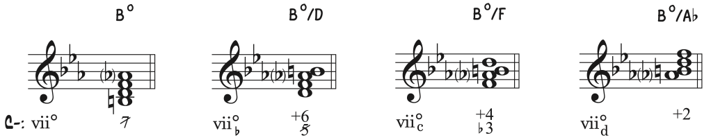 El acorde disminuido del modo mayor (séptimo grado) nos sirve de ejemplo para apreciar cómo cifrar un intervalo disminuido. Llegado tal caso, el número correspondiente se barra para indicar que se trata de un intervalo disminuido. En estado fundamental, la sensible está en el bajo y es imposible hacer referencia a ella, pero observamos en la primera y segunda inversión como el intervalo originado desde el bajo contiene la nota sensible, en este caso lo acompañamos del signo (+). De este modo podemos atribuirle para las inversiones algo de funcionalidad, ya que al contener la sensible nos da la pista de ser un acorde de dominante, pero tan solo en la primera y segunda inversión, ya que acordes disminuidos comparten el cifrado 5 barrado sin la misma función de dominante.