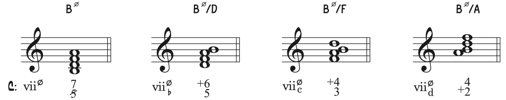 Séptima de sensible: «semidisminuido» en el modo mayor. En estado fundamental, cifraremos su quinta disminuida (tritono) y la séptima menor (7). En primera inversión, como es habitual en estos casos se cifra con seis-cinco, pero en esta ocasión la sexta será la sensible de la tonalidad (+6), la quinta con respecto a la es justa. La segunda inversión, también cuatro-tres simultáneamente nos garantizan estar en un cifrado de séptima en segunda inversión, y como en el caso anterior, cifraremos la nota sensible con un +, (+4) en este caso. Su tercera inversión, ciframos la fundamental (+, sensible) y con un cuatro (supertónica) para poder diferenciarlo del acorde de séptima disminuida que veremos a continuación.