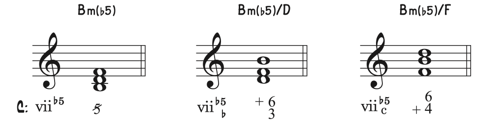 Para el mismo acorde encontrado en el segundo grado de la menor, se observamos que, pese a ser la misma sonoridad de quinta disminuida, las inversiones no están acompañadas de (+) ya que esto nos haría suponer que estamos en la tonalidad de Do siendo la nota Si la sensible. En este caso, al tratarse de la tonalidad de La menor, el segundo grado de un modo menor natural es disminuido, pero carece de atracción a la tónica menor (i), la sensible como atracción la encontramos en el séptimo grado cuando utilizamos el modo menor armónico, por tanto el séptimo (sensible) grado será el que debamos indicar con el signo (+) correspondiente. La nota (si) no es sensible de la menor.