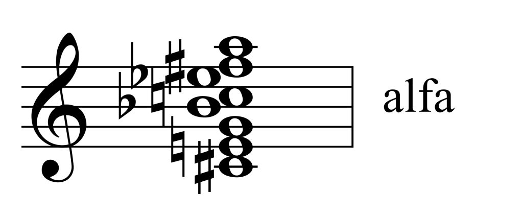 El acorde alfa se compone de los dos estratos de tónica y dominante superpuestos. Hallamos el acorde alfa desde la superposición de intervalos descendente (2, 5 y 8) al eje de tónica. Los ejes, se forman superponiendo una tercera menor (3).
