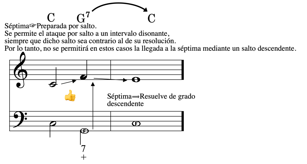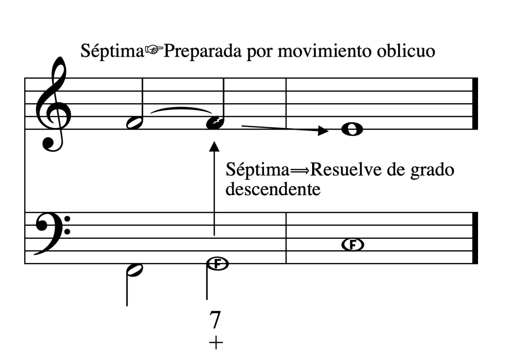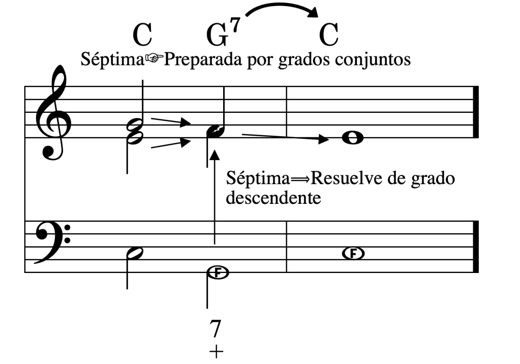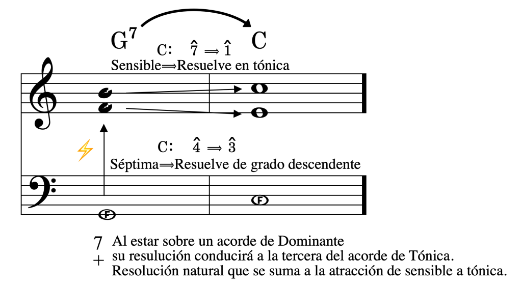 Igual sucede con el intervalo de séptima. Una vez escuchado un intervalo disonante resultado de una disposición armónica vertical, éste tiende a buscar su relajación de forma descendente por grado conjunto (indiferentemente que sea segunda mayor o menor). Por tanto, la séptima del acorde se ve obligada a descender de grado a la tercera del acorde, si su resolución es en Tónica.