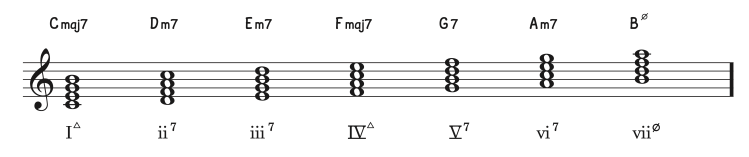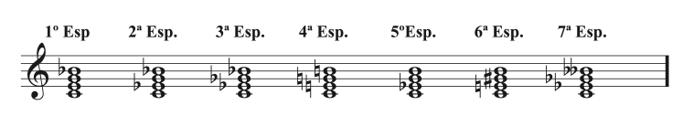 En las diferentes escalas de nuestro sistema tonal, los acordes cuatríadas formados desde cada uno de los diferentes grados aportan un abanico más amplio de posibilidades en cuanto a las diferentes constituciones que puede tener un acorde.