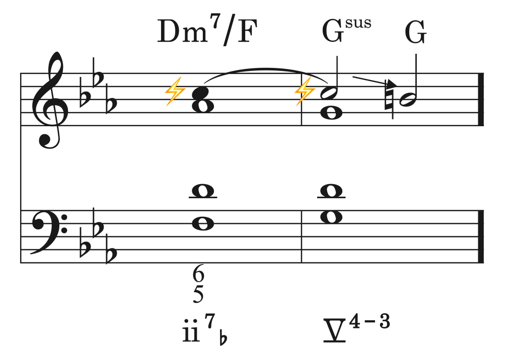 Resolución diferida. En este caso, la resolución llega después de atacar el acorde resolutivo aportando si llega a darse el caso, una tensión añadida en el segundo acorde.