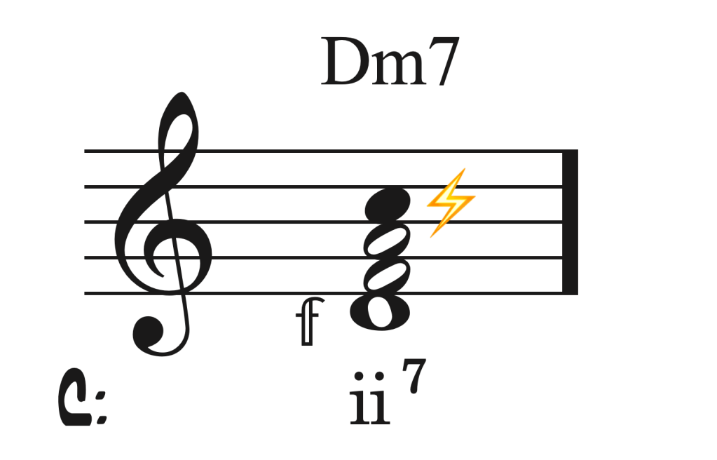 La fundamental es consonante, ya que es la nota que origina la estructura, teniendo la quinta y la tercera como sonidos consonantes si contemplamos su espectro. No origina ningún tipo de problema sí contemplamos el acorde como un acorde tríada. En cambio, la séptima resulta disonante, ya que al situarla a distancia de séptima desde la fundamental, encontramos un sonido lejano a los principios de la consonancia dado el espectro armónico.