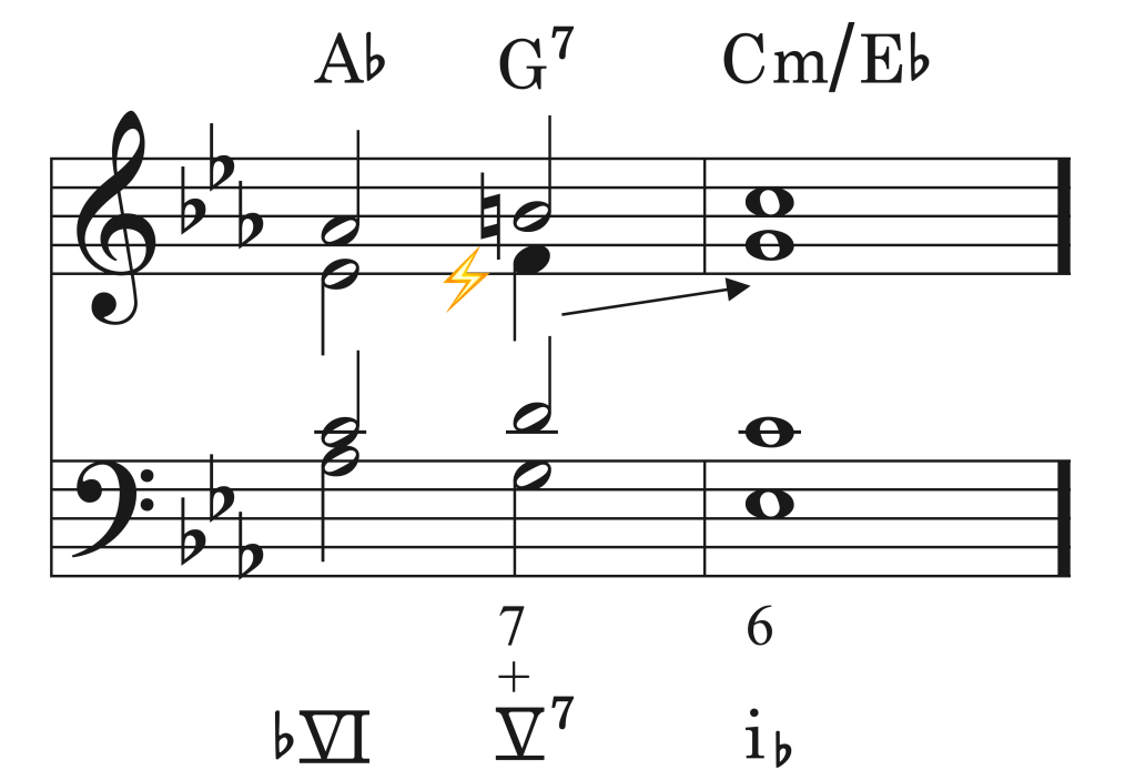 La séptima puede ascender de grado para evitar la duplicación de la tercera, sobretodo cuando la escuchamos simultáneamente en el bajo. Podremos acceder a ella y salir de ella por grado conjunto para suavizar y justificar mejor su resolución irregular, y siempre y cuando no se produzcan otras faltas estudiadas previamente.