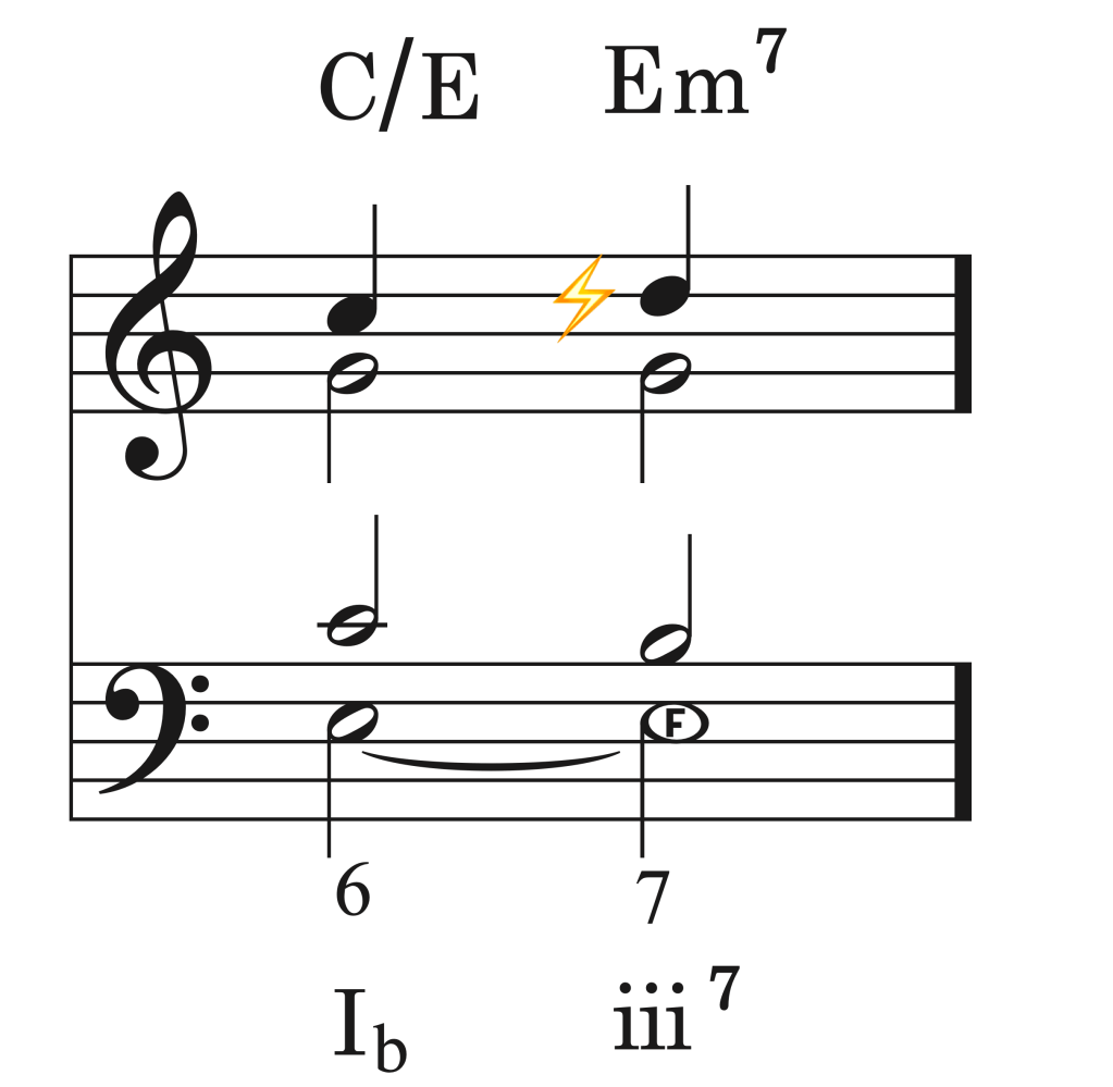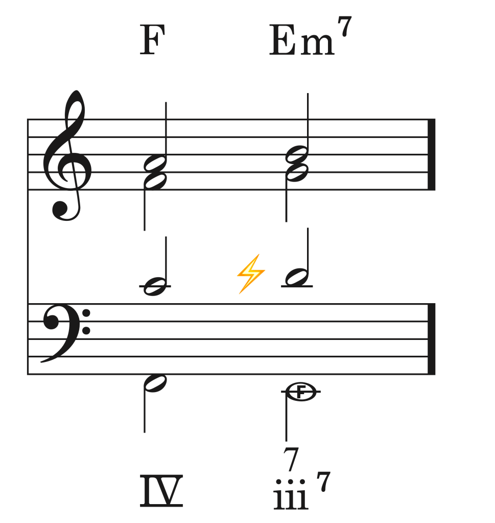 La séptima del acorde es nota real del acorde que le sigue. En este caso la séptima permanecerá inmóvil. En algunos casos se procede a un cambio de disposición del mismo acorde de séptima por el encadenamiento de un acorde puente que embellece el discurso musical.