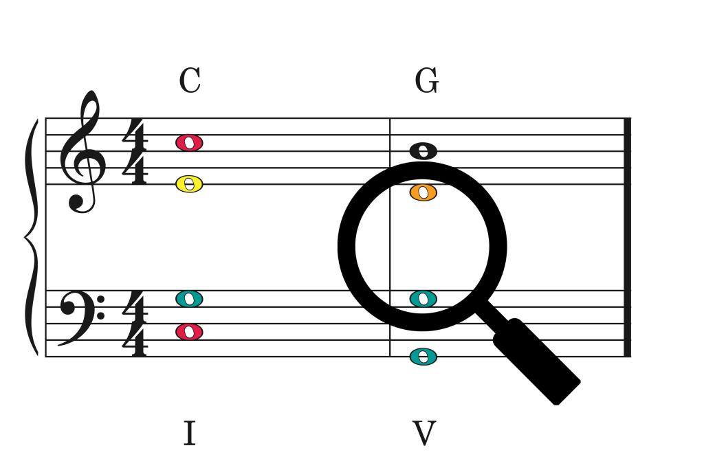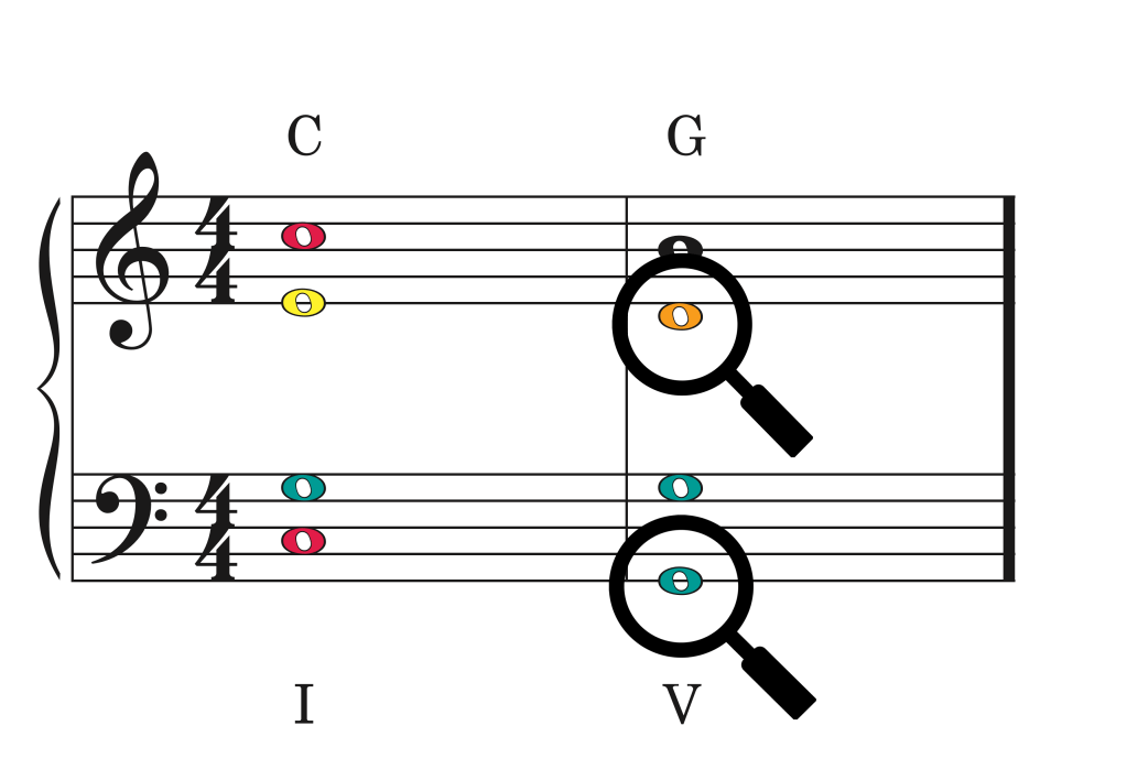 Sí, puedes triplicar una nota, siempre y cuando sea la fundamental. El acorde que tengo a revisar en este momento es G (Sol Mayor), si tengo claro que no he duplicado la tercera y solo la he puesto una vez, buscaré entre las voces del acorde las notas implicadas en alguna duplicación. En primer lugar, la realización más común es duplicar la fundamental, por tanto en mi acorde buscaré si la he duplicado (Sol-Sol). Una vez localizadas, he de olvidarme del resto de notas del acorde por el momento. Observa como en el siguiente ejemplo la octava implica las voces del tenor y el bajo. Ahora veremos si las voces se comportan de forma independiente.