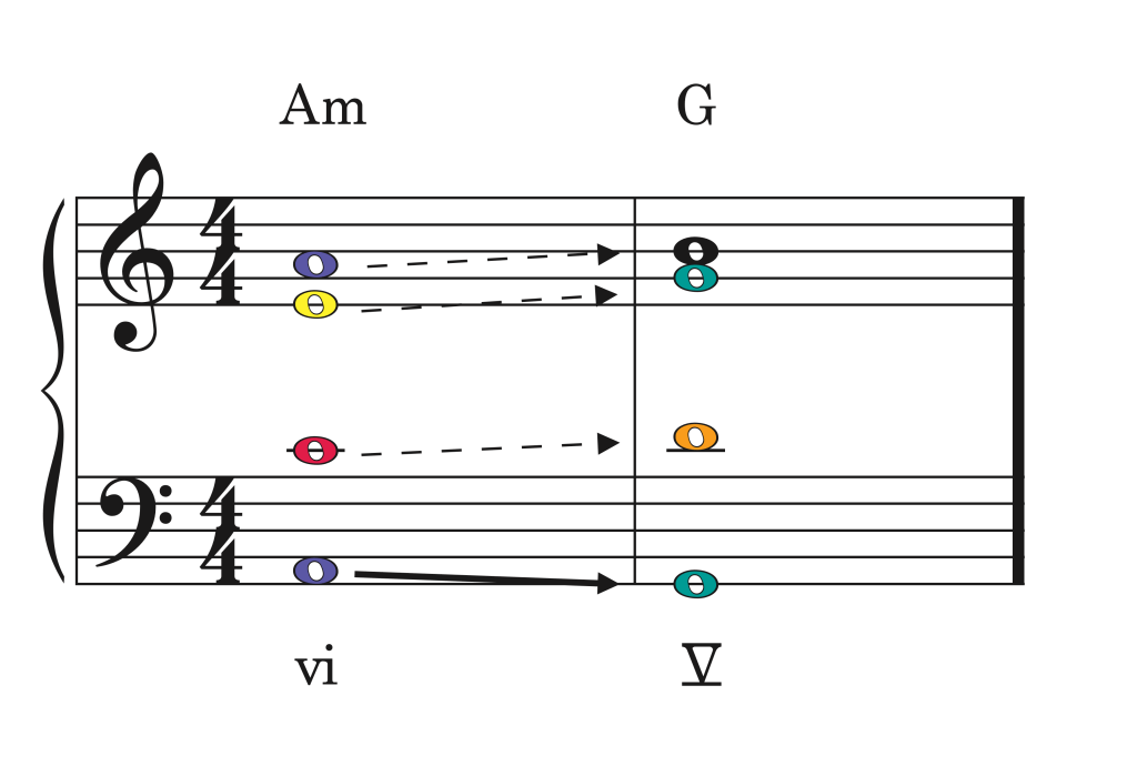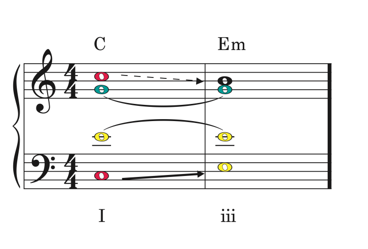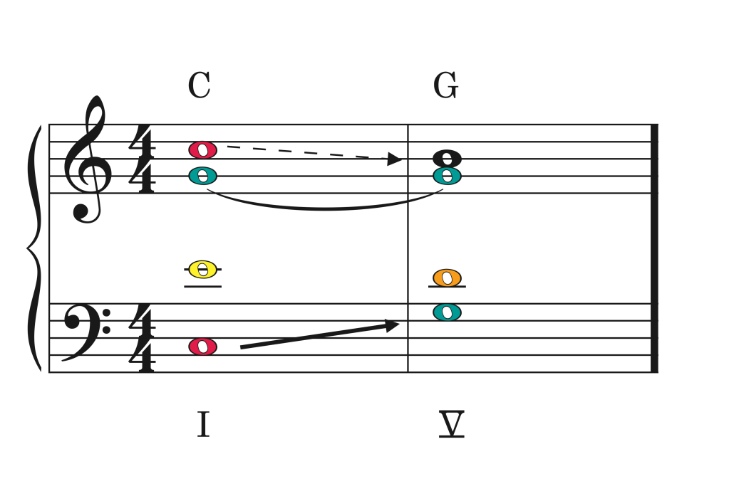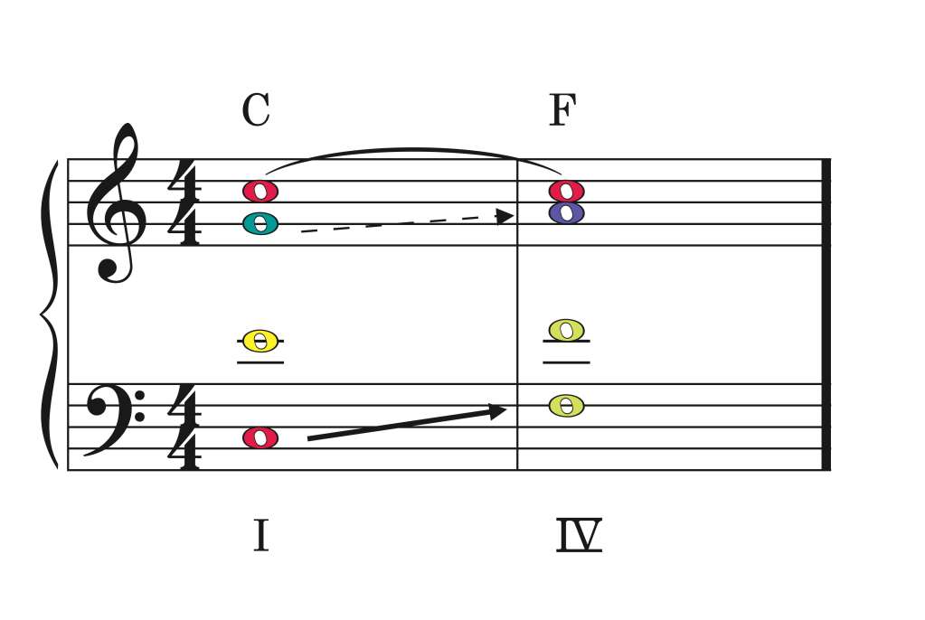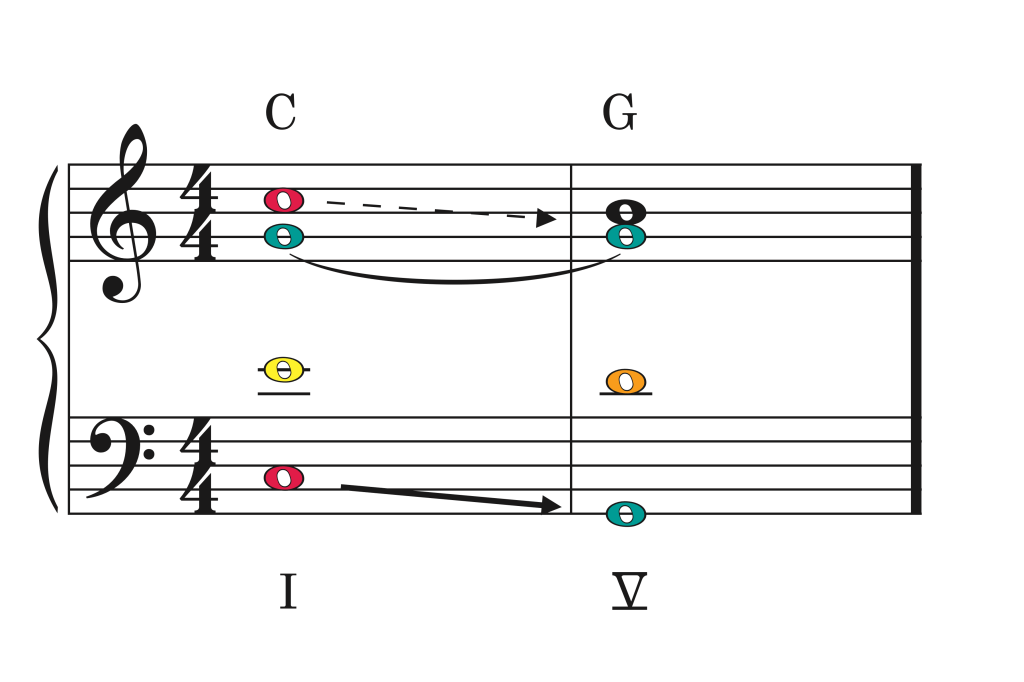 Movimiento de cuarta en el bajo. Una nota en común. El resto de las voces que no se mantienen se mueven directamente con la dirección que toma el bajo, es decir, en la misma dirección. Recuerda, siempre a la nota más cercana.