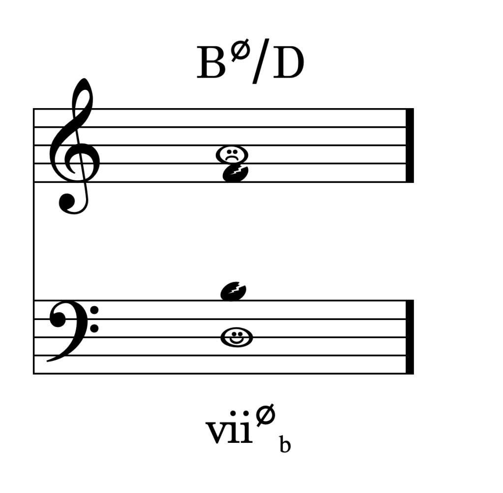 Recuerda la disposición en los acordes de séptimo grado del modo mayor: La séptima menor del acorde debe estar siempre a distancia de séptima con la fundamental (sensible en este caso), no debe colocarse más baja que la fundamental, de esta forma la sonoridad queda mejor equilibrada y definida. Este acorde contiene a parte de la disonancia del propio intervalo de séptima, la disonancia atractiva de tritono tonal.