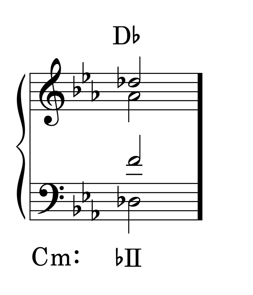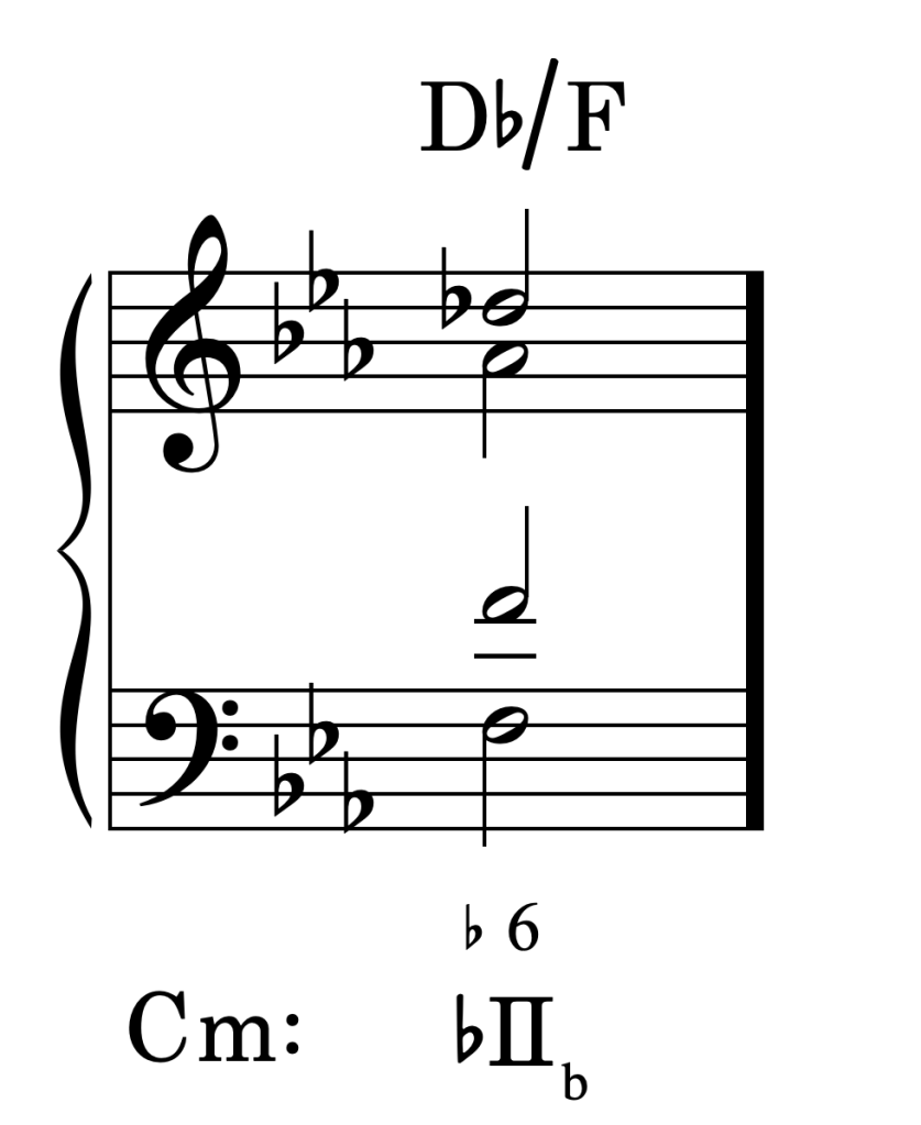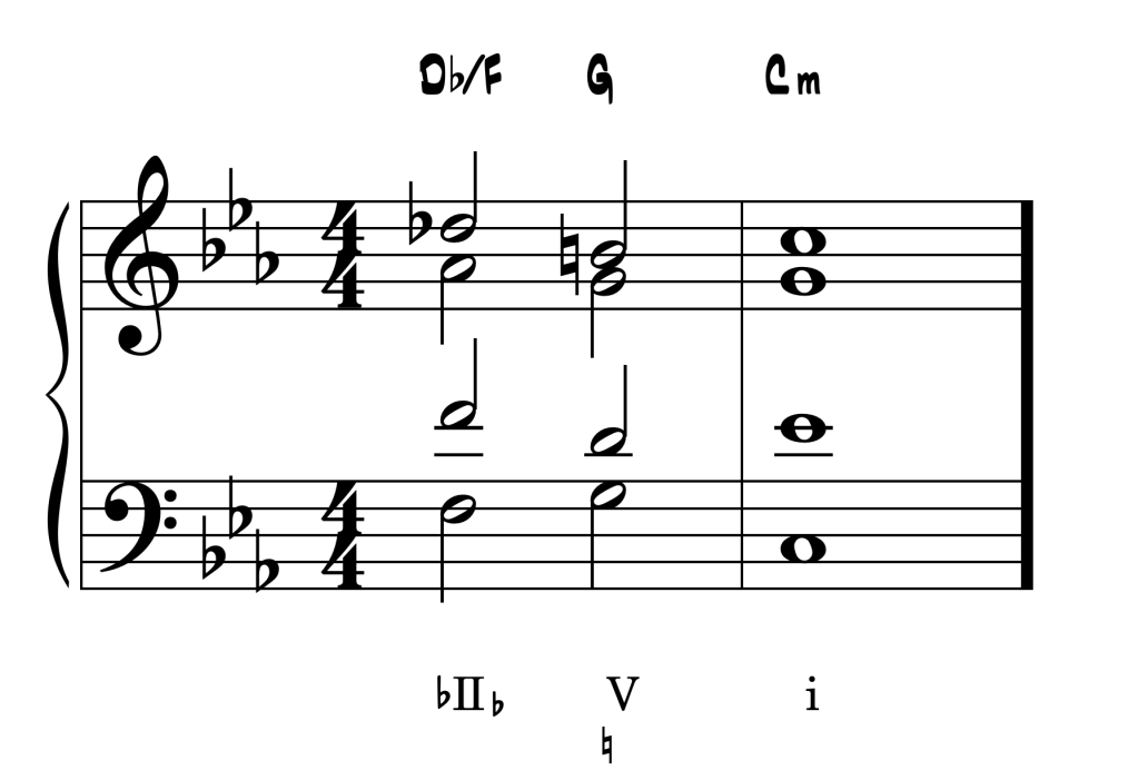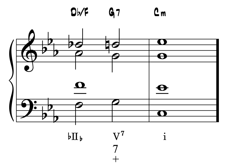 Como se puede apreciar en el ejemplo anterior, la progresión armónica subdominante-dominante está establecida dentro de una jerarquía cadencial de cadencia auténtica compuesta. El acorde napolitano mantiene la misma progresión que dirige la carga armónica desde un acorde con función de subdominante a la dominante. Se puede observar como las notas características propias de la cadencia se mantienen en el bajo. (Fa Sol Do)