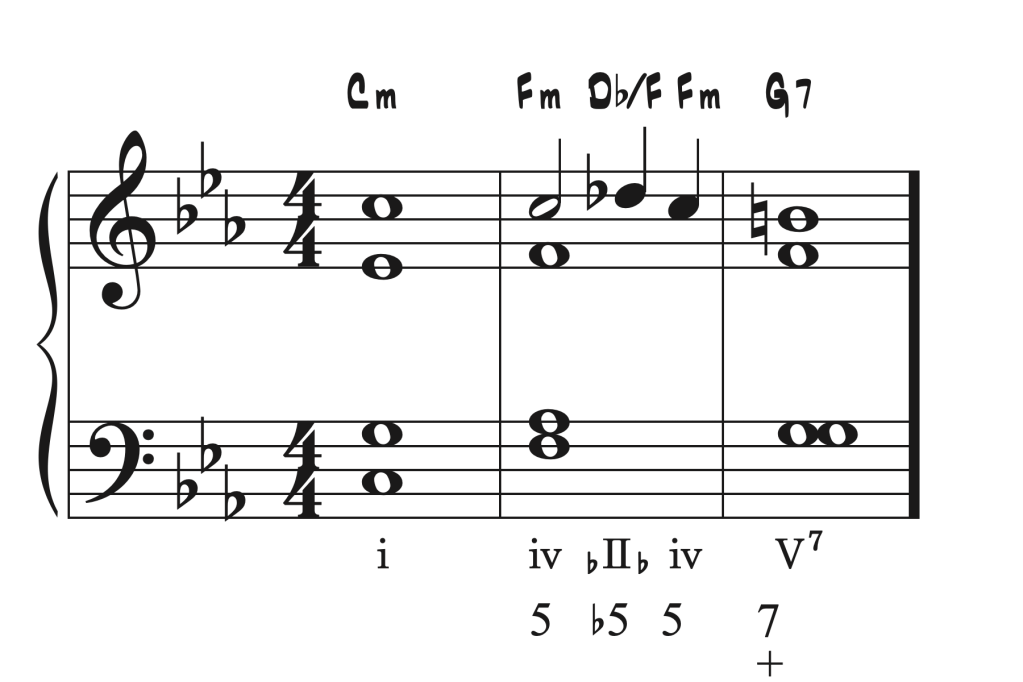 En la progresión armónica (iv-V) del modo menor, puede observarse como la tónica de la tonalidad de Do, aparece en el cuarto grado como quinta del acorde. Podemos trazar un doble floreo de semitono ascendente-descendente el cual origina en el ascenso un nuevo acorde llamado acorde napolitano. El hecho de estar sobre la subdominante de la tonalidad (Fa) le confiere un carácter de subdominante que prepara la llegada del (V) dominante para resolver en tónica.