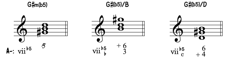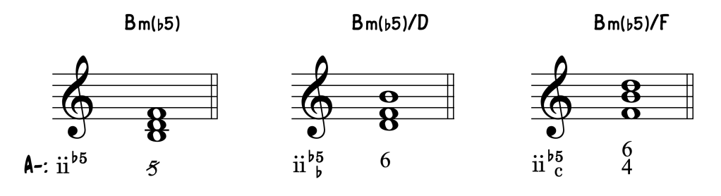 Inversiones: Para diferenciarnos del acorde de Dominante, las inversiones del acorde triada de séptimo grado contienen dos cifras que señalan la distancia que se encuentran las notas restantes del acorde.