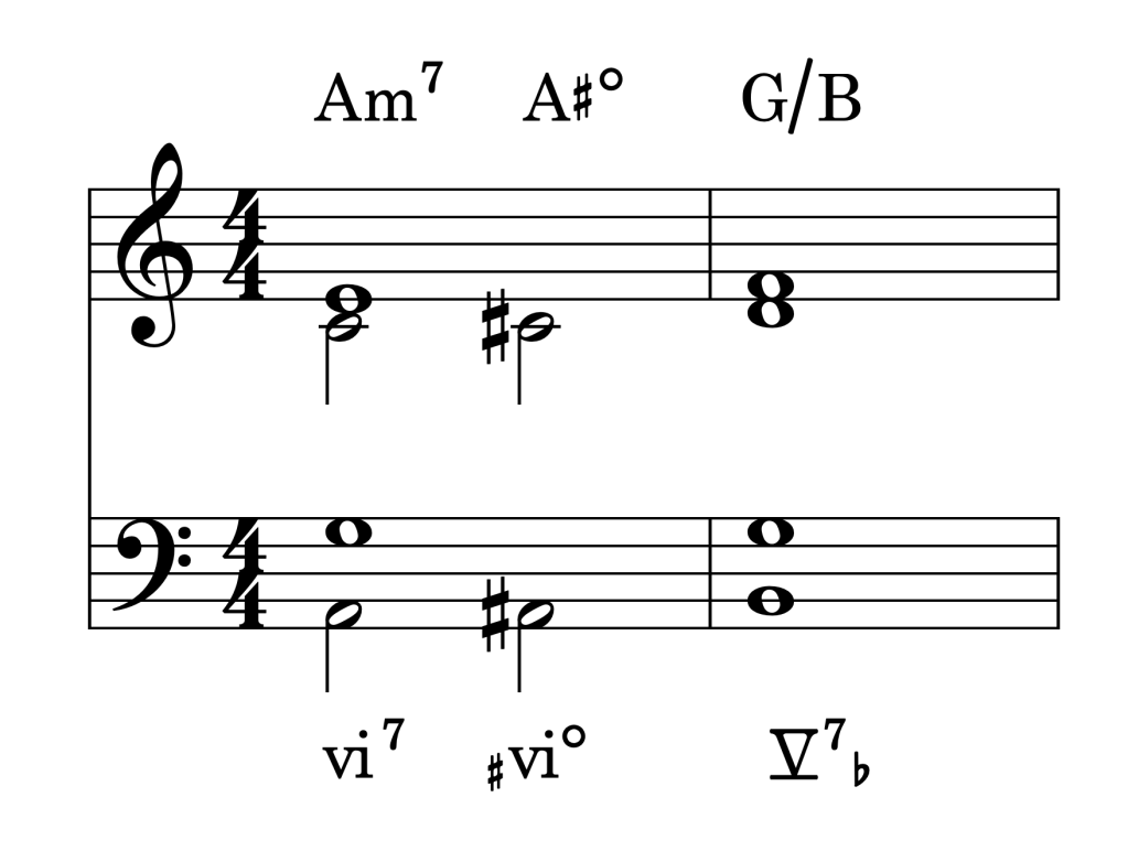 La unión de los acordes presentados en estos ejemplos pueden realizarse en cualquiera de sus inversiones sin alterar el concepto de grado alterado, a pesar que la nota del bajo sea distinta, ya que nos referimos en todo momento a grados alterados y sin alterar el resultado en la conducción melódica.