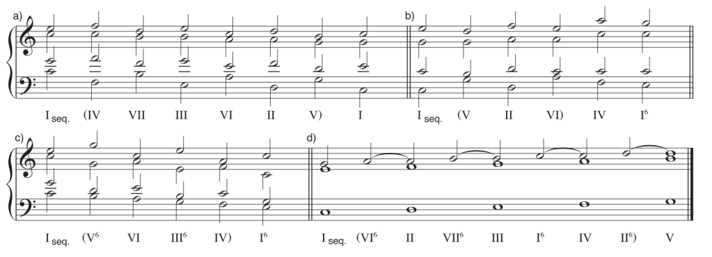 Segunda ascendente (por grado conjunto), I–ii6–iii–IV6–V–vi6–viiº–I (de uso frecuente).