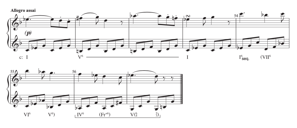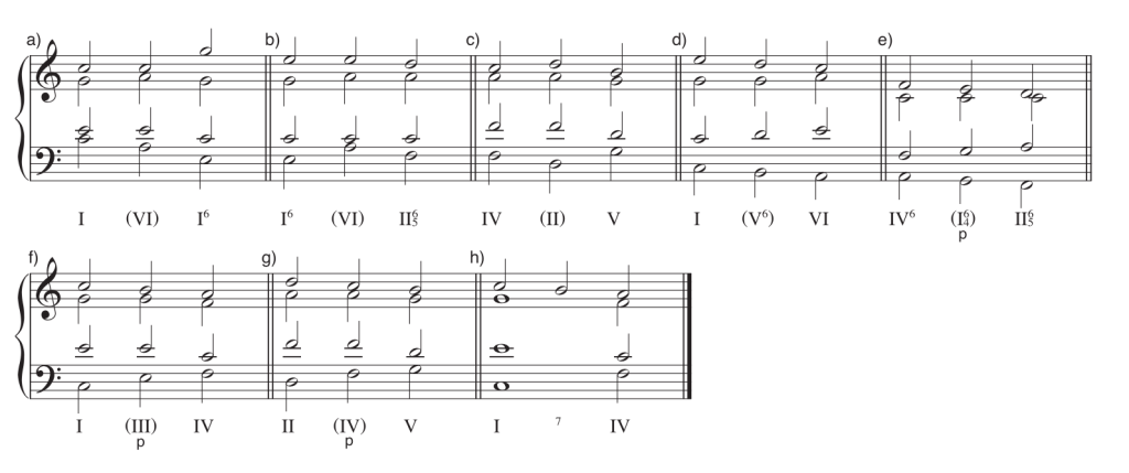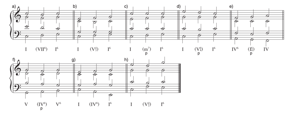 Los cuatro compases iniciales prolongan la armonía de tónica en posición fundamental mediante una dominante subordinada en primera inversión (V6), que funciona como acorde vecino. Los compases siguientes presentan una progresión secuencial descendente por grados conjuntos, seguida de una progresión semicadencial incompleta, iniciada por el predominante IV6 (embellecido a su vez por la sexta aumentada italiana).