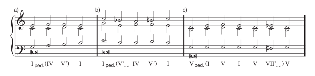 Un consejo de notación analítica: las situaciones de pedal requieren una notación analítica específica. Puesto que las armonías subordinadas pierden su bajo (en favor del pedal), siempre se colocarán entre paréntesis.